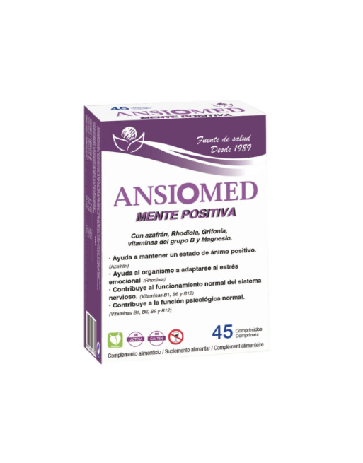 Ansiomed mente positiva es una fórmula compuesta por triptófano, grifonia valorada al 20% en 5HTP, azafrán, lúpulo, rhodiola y magnesio. Con triptófano y extracto de grifonia valorada al 20% en 5HTP (5-hidroxitriptófano). El Azafrán que contribuye al equilibrio emocional, ayuda a apoyar la relajación y a mantener un estado de ánimo positivo. (EFSA: 2038) Con extracto de lúpulo que favorece un efecto calmante para el sistema nervioso (EFSA: 4419) Con rhodiola contribuye a una actividad mental y cognitiva óptima. (EFSA: 3877). Ayuda al organismo a adaptarse al estrés emocional, el esfuerzo físico y ayuda a estimular el sistema nervioso (EFSA: 2659 ) El magnesio contribuye al funcionamiento normal del sistema nervioso y a la función psicológica normal. (EFSA: 242, 245, 246) Con vitaminas B1, B6, B12 que contribuyen a una función psicológica normal. (EFSA: 95, 97, 98, 100, 102, 109, 77, 205, 81, 85, 86, 88)