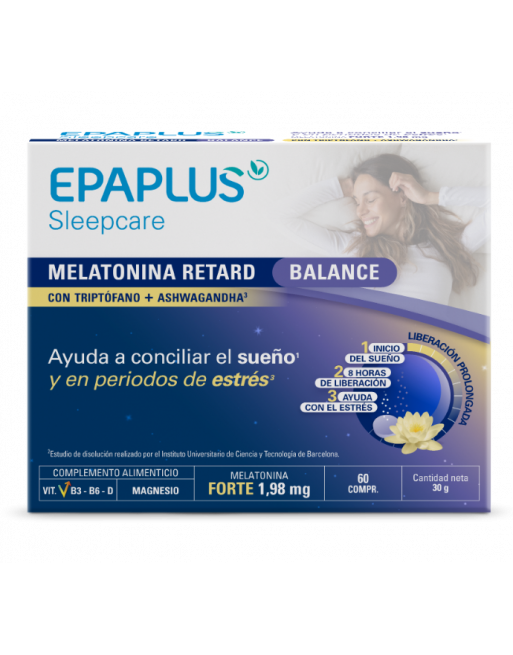 Epaplus Sleepcare Melatonina Retard Balance es un complemento alimenticio a base de melatonina (1,98 mg), ashwagandha, TRP, vitaminas y minerales. Para el estrés del día y sueño de noche. Su innovadora fórmula en comprimidos RETARD facilita la liberación prolongada y sostenida de ashwagandha y melatonina durante toda la noche (8 horas).