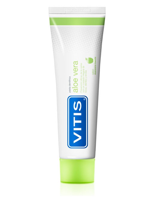 Vitis aloe vera pasta dentífrica sabor manzana-menta es una pasta dentífrica de uso diario formulada especialmente para prevenir la caries, ya que reduce eficazmente el biofilm oral (placa bacteriana) y remineraliza el esmalte dental.